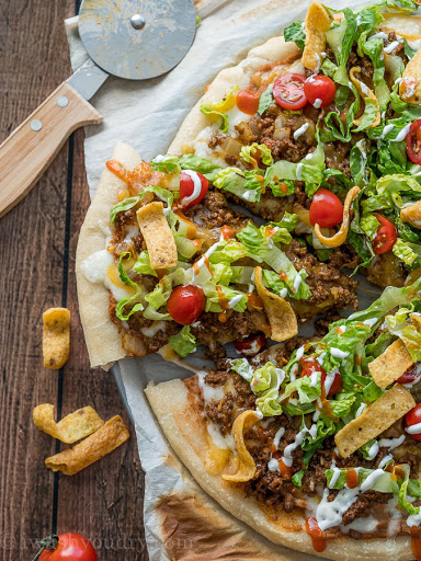 Remove pizza crust from oven and top with the warmed refried beans and smooth into an even layer. Sprinkle with cheese and taco meat. Return to oven for an additional 6 to 7 minutes, until pizza crust is golden brown and cheese is melted.