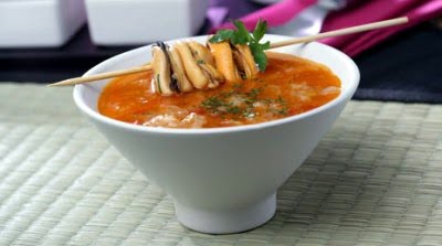 Sirve en boles individuales acompañando con unas brochetas montadas con algunos mejillones que habremos reservado.
