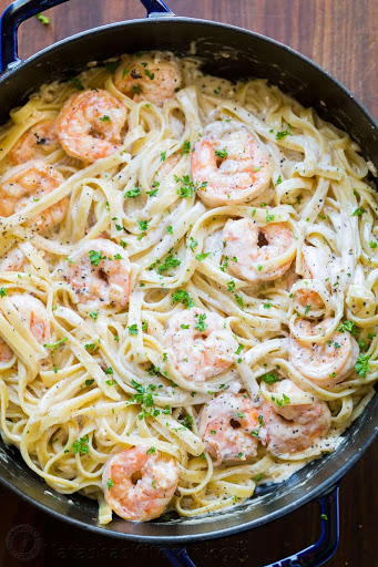 Stir in the drained pasta and cooked shrimp, tossing with the noodles until well coated.