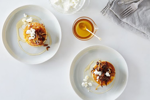 Griddled Polenta Cakes with Caramelized Onions, Goat Cheese, and Honey