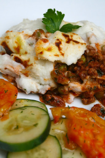 9. Once the cauliflower is prepared, spoon the meat mixture into a square casserole dish (you can use a larger rectangle, but your filling will be thinner). Then, either spoon or, using an icing tip, pipe the mashed cauliflower on top of the meat. Make sure you create lots of peaks and crevasses--these are what will brown in the oven.