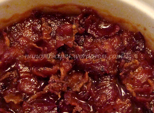 Bake uncovered at 350 degrees for an hour to an hour and half...or until bacon is crisp