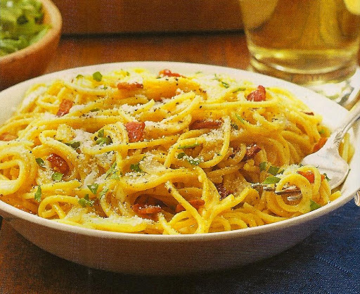 Cook onion and garlic in drippings over medium low heat until beginning to soften, 2-3 minutes. Add 1/4 cup reserved pasta water and spaghetti.