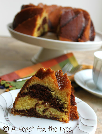 Spoon the batters alternately into the prepared pan. Using a table knife, swirl them together to create a marbled effect.