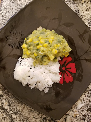 Mukimo is a staple dish of the community Kikuyu in Kenya. There are many variations, this delicious version features mashed potatoes, onions, spinach, corn and peas served over rice. Enjoy!