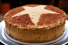 Just before serving, dust the top of the cake with cocoa. I cut a star shape out of waxed paper and placed it lightly over the cake, and shaved a layer of chocolate over it with a microplane, before carefully removing the star to leave a stenciled shape.