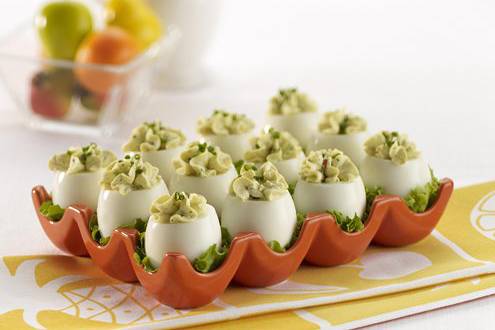 Cut the fat rounded ends off the eggs and scoop the yolks into a bowl. Stand the hard-boiled egg whites upright in the egg carton. If you prefer to serve the eggs on a platter, trim a small piece of egg off the pointed ends so they will stand upright.