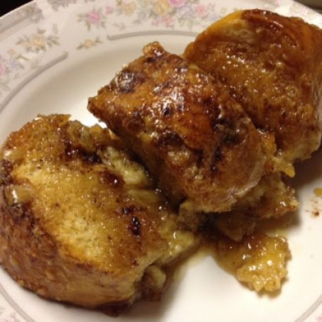 The next morning, preheat the oven to 350 degrees F. In a small saucepan, combine butter, brown sugar and corn syrup; heat until bubbling. Pour over bread and egg mixture. Again, I use a measuring cup to pour it so that I can make sure all the slices are covered.