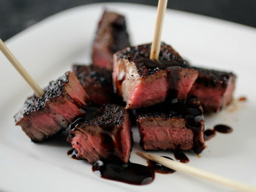 Cut the rested beef into 1-inch cubes and transfer to a large platter. Drizzle the warm pan sauce over the cubed steaks and serve immediately with toothpicks.
