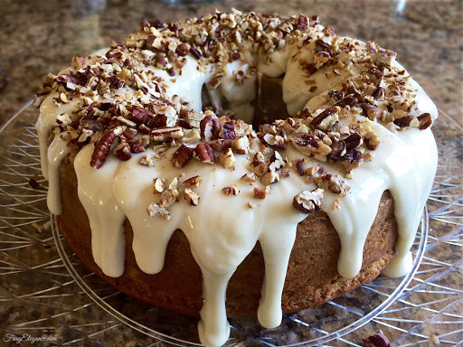 Bake at 350° for 1 hour to 1 hour & 10 mins or until a long wooden pick inserted into center comes out clean. Cool cake on a wire rack 15 minutes, then remove from pan to wire rack to cool completely (approx 2 hours).