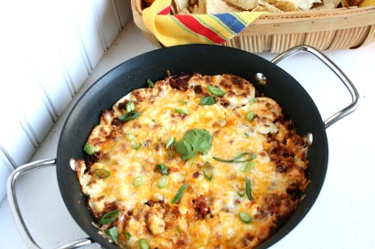 Remove skillet from oven. Sprinkle with green onions for garnish. Serve with chips for dipping.