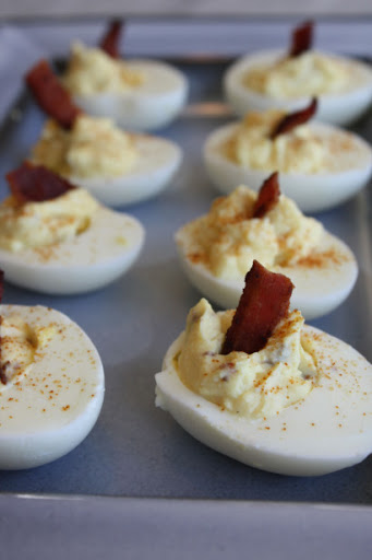 Spoon yolk mixture into egg whites. Sprinkle with paprika and garnish with the remaining piece of bacon (broken into pieces).