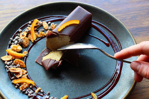 6. Put one frozen coffee custard on the tines of a fork and dip it into the Magic Shell. Tilt it slightly, so any excess runs off the top and down the edge. Let the Magic Shell start to harden before sliding the coffee custard off the fork with an offset spatula onto a sheet of acetate or sturdy parchment paper.