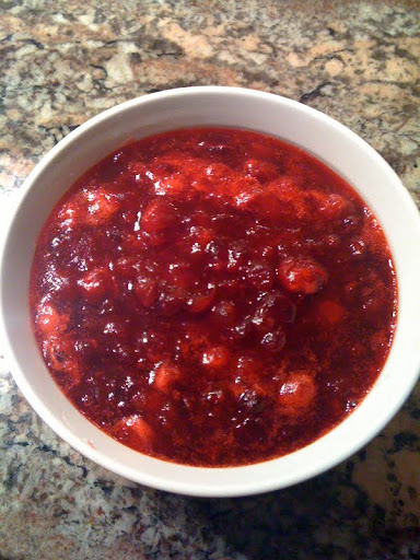 boil water and sugar, add cranberries, simmer until berries pop open and sauce gets syrupy. cool completely, cover and refrigerate.