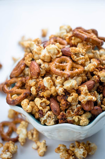 Slow Cooker Caramel Popcorn Snack Mix is sweet, smoky and super easy to make in a crock pot. A delicious snack to enjoy during game and perfect for giving during the holidays.