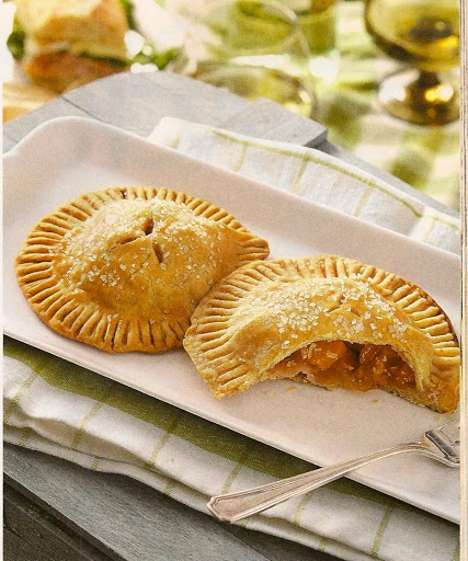 Combine peaches, 3 tbs sugar, cornstarch, zest, lemon juice and salt. Unroll crust on a lightly floured surface, then cut four circles with a 4 1/2 inch cutter. Arrange two dough circles on prepared baking sheet. Roll remaining dough circles to about 5 1/4 inches in diameter. Using a slotted spoon, place 1/3 cup filling on the centers of dough circles on baking sheet. Brush egg around edges, then top with larger dough circles and press edges together to tightly seal. Crimp edges with a fork. Brush tops of pies with remaining egg and sprinkle with sanding sugar. Cut two to three slits in tops. Bake pies until crusts are golden and filling bubbles, 25-30 minutes. Let pies cool 10-15 minutes; serve warm or at room temperature.