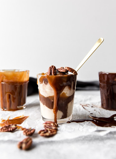 Layer the vanilla ice cream with the hot fudge sauce, salted caramel sauce and pecan halves as desired. Enjoy!
