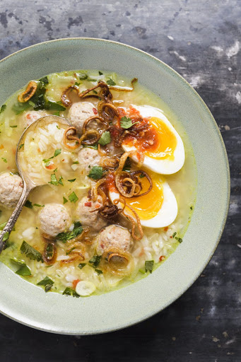 Remove and discard the lemon grass. Add the meatballs, stir gently to combine and simmer over medium until the meatballs are just cooked through, 3 to 4 minutes. Stir in the rice and cook until heated through, about 1 minute. Off heat, stir in the remaining 2 tablespoons fish sauce, the remaining 1 tablespoon chili-garlic sauce, the remaining 1 teaspoon white pepper, the cilantro and the lime juice. Ladle into bowls and serve with fried shallots, egg halves, chili-garlic sauce and lime wedges.