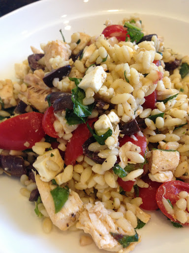 Cook pasta per instructions and strain and rinse with cold water. Stir in chicken, feta, tomatoes, parsley, and olives. Add about a 1/3c of the dressing and stir gently. You can add a little more if needed. Salt and pepper to taste.