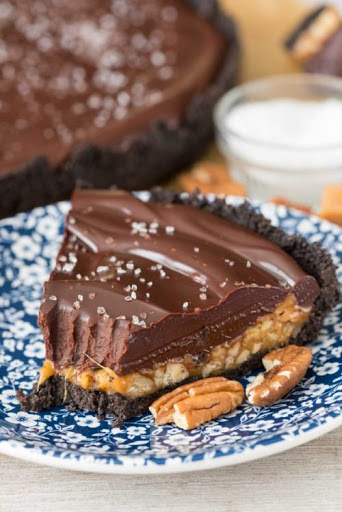 Salted Caramel Pecan Chocolate Pie has an Oreo crust, a salted caramel pecan layer, and a thick chocolate ganache layer topped with sea salt! This pie is the epitome of decadence!