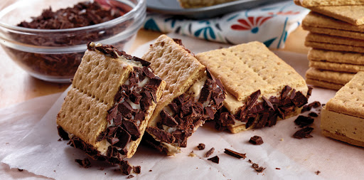 Spread the mixture in an even layer in the prepared dish, and freeze for at least 6 hours. When frozen, slice the ice cream into 9 squares and sandwich between the graham crackers. Roll the edges in optional chocolate, if desired, and refreeze for 1 hour. This will allow the graham crackers to soften slightly. Freeze the leftover ice cream sandwiches between parchment paper in a freezer- safe container or freezer bag.