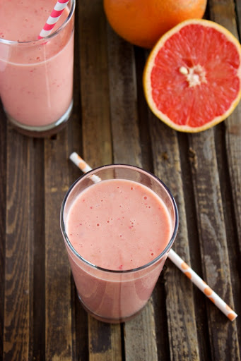 ). Slice the grapefruit into thick rounds and remove any seeds. Place the rounds of grapefruit into a blender along with remaining ingredients. Process until smooth.