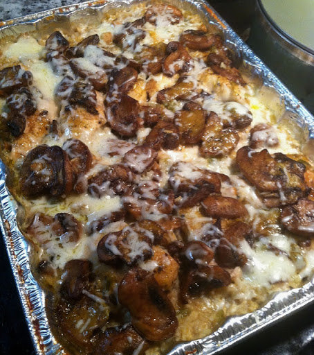 Bake uncovered for 2 hours, checking water after 1 hour. (If water is absorbed before chicken and rice are completely cooked, you can add an additional 1/2 cup to keep moist) Remove from oven, sprinkle with remaining mushrooms and cheese; return to oven to allow to melt.