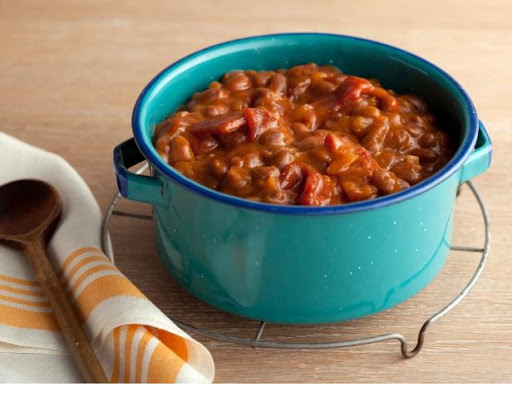 Combine beans, molasses. onions, brown sugar, ketchup and mustard into greased oven dish. Stir until all ingredients are fully combined.