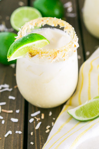 Spread the honey on a plate and the sea salt and toasted coconut on another plate. Dip the serving glass in honey and then in the sea salt and toasted coconut. Add ice to the glass and strain the shaken margarita into the glass. Garnish with a lime slice.