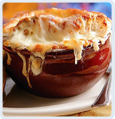 1. Ladle the soup into individual bowls and cover each with a thick handful of Gruyere cheese.