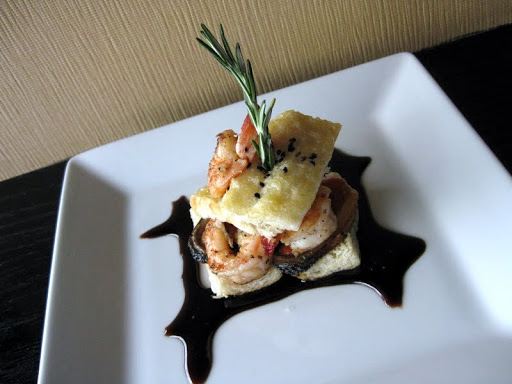 .- En la base de un plato extienda un par de rebanadas de pan de caja semi tostado.Sobre de estos coloque los mejillones - Retire el palillo de los camarones y colóquelos sobre los mejillones, luego los filetes de róbalo .