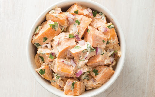 In a large bowl, whisk together mayonnaise, juice, chipotle chile powder, salt, and pepper to taste. Add sweet potatoes, onion, and cilantro; toss gently to combine.