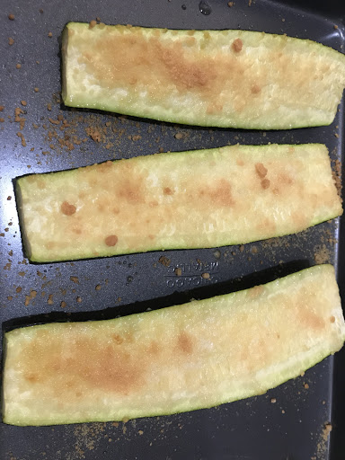 Zucchini halves are sprinkled with a little Parmesan cheese, salt, pepper and then baked for 15 minutes in a 400°F oven. Simple and delicious!