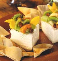 Arrange fruit, almonds, and melon in and around the hollowed cheese "bowls." Stir fennel tops or fennel seed into reserved cheese and serve with cheese bowls of fruit and pita bread wedges.