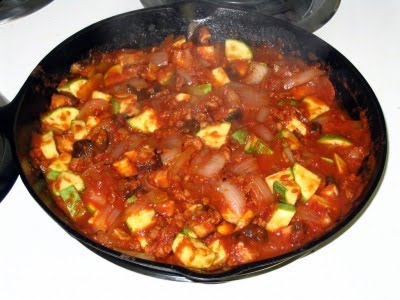 Saute onion and bacon in olive oil, add hot pepper flakes. When bacon is done, add zucchini for about 10 minutes. Add tomatoes and stir until warm. Add semi-cooked pasta to finish off. Sprinkle with Parmesan cheese.