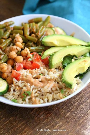 Layer the bowl with the spicy chickpeas, green beans, greens of choice, roasted or raw veggies of choice, brown rice and a generous drizzle of the chickpea cream sauce. serve warm or cold. Sprinkle salt, pepper and lemon juice if needed.