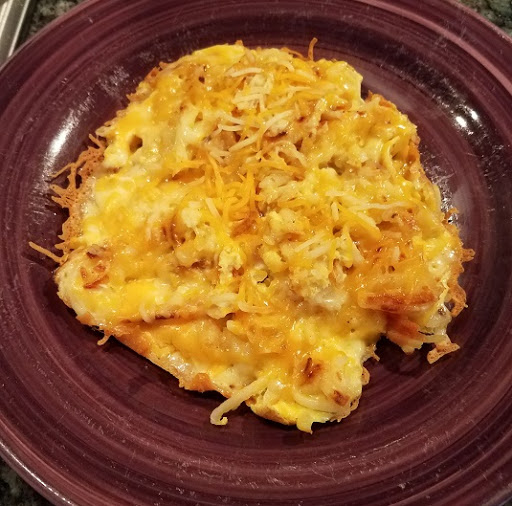 Stirring occasionally (really more like poking at it to ensure there are no 'puddles' of uncooked eggs), sprinkle the cheese on top. I like to put some around the edges so it gets crispy. Once the cheese is almost melted on top and crispy around the edges, it's all set.