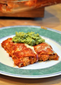 Place chicken in a medium bowl and top with about 1 1/2 cups enchilada sauce. Add 1/2 cup shredded cheese and stir well.