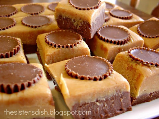 2nd layer: Combine peanut butter chips, 1 can sweetened condensed milk and 2 T butter in a double boiler or metal bowl over simmering water, stir until melted and smooth. Pour onto the milk chocolate fudge layer and press Reece's Peanut Butter Cups into the fudge. I left a small space between them for a 'cutting line'. Let cool until room temperature. Refrigerate overnight or until set. Remove from refrigerator and cut into squares(1 peanut butter cup per square) and serve. Keep refrigerated or they will get too soft. The milk chocolate doesn't set up as solid as semi-sweet chocolate.