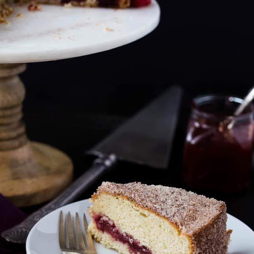 Combine the sugar and cinnamon in a small bowl. Flip the cake upright onto a serving platter. Brush the top and sides of the cake with melted butter. Press the cinnamon sugar mixture into the top and sides of cake. Slice and serve. The cake will keep for up to 3 days covered tightly and stored at room temperature or in the refrigerator.
