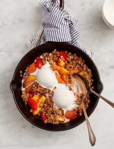 Place the sliced peaches and plums into the skillet, sprinkle the crumble mixture on top and bake until the topping is golden brown and the fruit is soft, about 15-18 minutes.