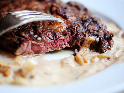Grilled Ribeye Steak with Onion-Blue Cheese Sauce