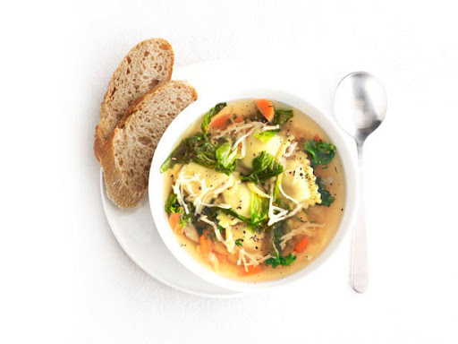 Heat the olive oil in a large pot over medium heat. Add the onion, carrots, celery and thyme and cook, stirring occasionally, until the vegetables begin to soften, about 4 minutes. Add the broth and 3 cups water and increase the heat to high. Cover and bring to a boil, then add the ravioli. Reduce the heat to medium and simmer until the ravioli are tender (see label for approximate cooking time).