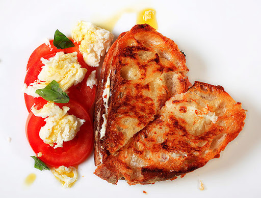 Heat one teaspoon butter and one teaspoon olive oil in a large non-stick skillet over medium heat until foaming subsides. Add both bread slices and cook, swirling occasionally, until pale golden brown on bottom side, about 2 minutes.