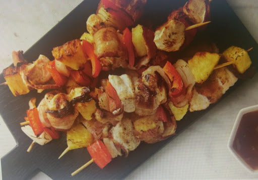 Thread the skewers. You'll need two strips of bacon per skewer if using 4 pieces of chicken and 3 pieces each of pineapple, bell pepper and onion. Weave the bacon around each piece of chicken and pineapple, stick the bell pepper and onion together and weave th bacon around both of those. Brush some olive or vegetable oil evenly over each kabob.