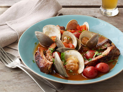 Add the smashed garlic and tomato to the pot and bring to a simmer over medium-high heat. Add the clams, cover and cook until some just open, 5 minutes. Add the potatoes and ribs, cover and cook until all the clams open, 10 to 15 more minutes (discard any unopened clams). Stir in the parsley and lemon juice. Serve with lemon wedges.
