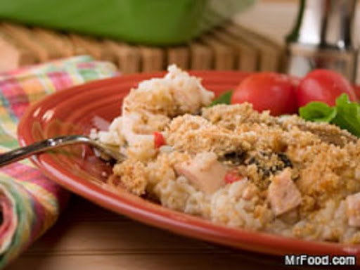 Remove from heat and add chicken broth, chicken gravy, mushrooms, pimientos, and rice; mix well. Pour into prepared baking dish, cover with aluminum foil, and bake 30 minutes.