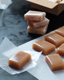 Lifting by parchment overhang, transfer caramel to a large cutting board. Cut into 3/4-by-1 1/4-inch pieces; wrap each piece in waxed paper or cellophane.