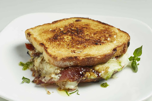 Spread 1 tablespoon reserved pesto on each bread slice. Layer four bread slices with mozzarella, bacon and gorgonzola. Drizzle each with balsamic reduction. Top with remaining bread slices, pesto side down. Spread outsides of sandwiches with mayonnaise, lightly pressing together. Cover and refrigerate any remaining pesto; save for a different recipe. Toast one sandwich, covered, in a warm, large nonstick skillet over medium-low heat for 2-3 minutes or until side is golden brown. Flip sandwich; cook, uncovered, 2-4 minutes longer or until bread is golden brown and cheeses are melted. Repeat with remaining sandwiches.