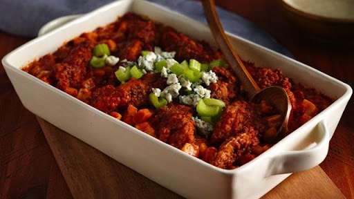 3. Cover; bake 15 minutes. Uncover; bake 15 to 20 minutes longer or until potatoes are tender and chicken is hot in center of thickest pieces. Sprinkle with blue cheese and celery.